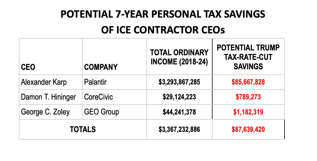 CEOs of the three corporations most heavily involved in the Trump administration’s brutal immigration crackdown have saved up to a collective $88 million from his first tax law enacted in 2017 and are due to enjoy similar savings in the future now that the law has been made permanent, according to a new analysis by Americans for Tax Fairness (ATF). The three companies they head have all announced huge revenue boosts from their role in the administration’s massive crackdown on undocumented immigrants.