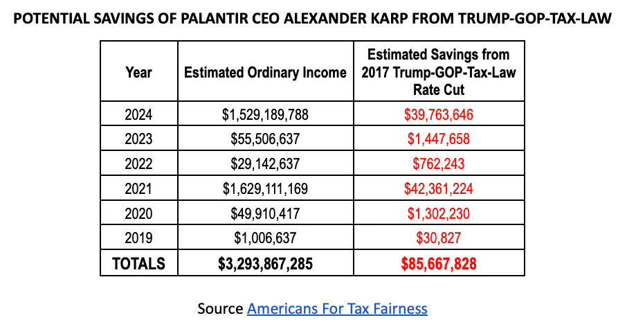 The billionaire CEO of Palantir Technologies–a data research firm that critics say threatens American privacy and is facilitating the Trump administration’s mass deportations–could have saved up to $86 million on his personal taxes over six years from just one part of the Trump-GOP tax law Republicans recently extended. That’s the finding of an Americans for Tax Fairness (ATF) study of tax and corporate-compensation data. Palantir chief Alexander Karp, who was recently worth an estimated $13.3 billion, could have reaped those income-tax savings exclusively from the lower tax rates in the law.